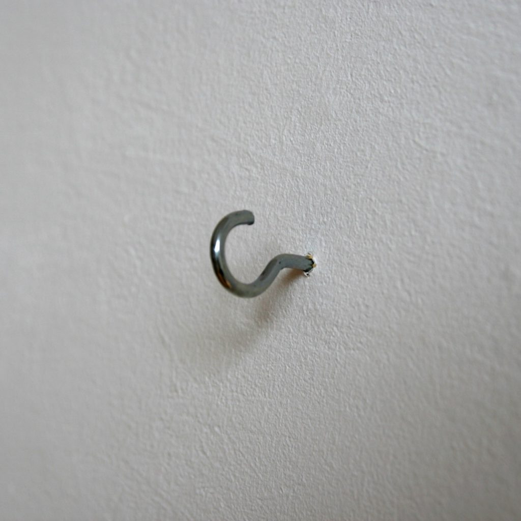 Photographies posées au sol avec, sur le mur, un crochet à leur aplomb.