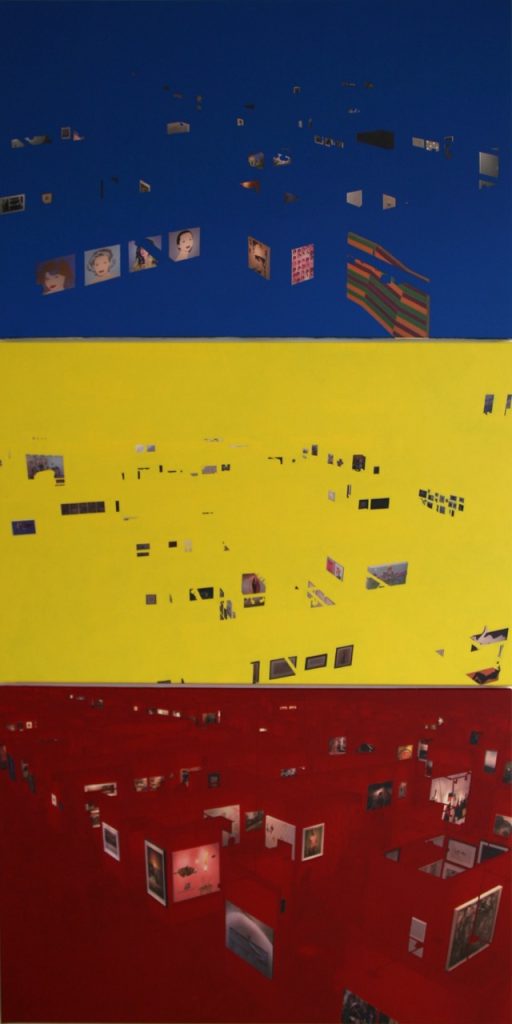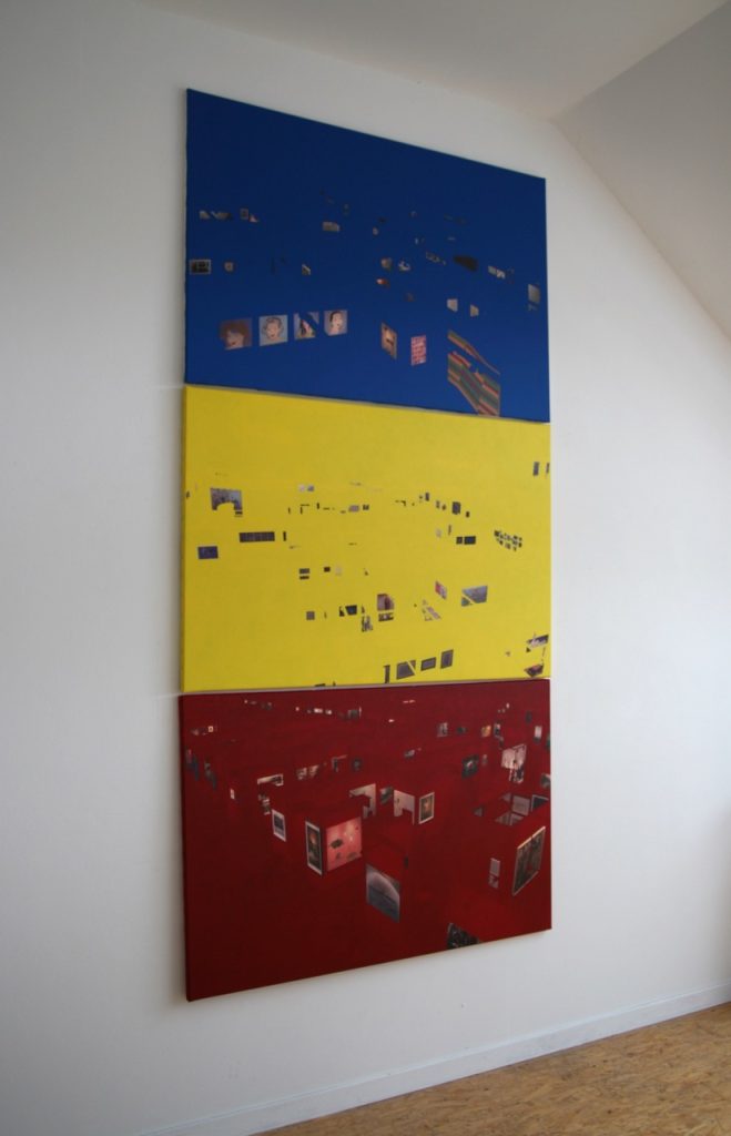Ce triptyque baptisé «peinture & peintures» est composé de trois photographies de foires d’art contemporain et de trois couleurs primaires.